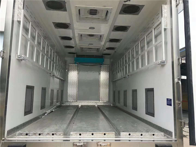 【豬苗車】上裝配置:外玻璃鋼,內(nèi)不銹鋼,兩層液壓升降層板,尾部液壓翻轉(zhuǎn)上豬平臺,層板為不銹鋼骨架鋪鋁花紋板。外部電動升降窗,排氣扇,柴油發(fā)電機,暖風(fēng)加熱,喂水系統(tǒng),凈水箱、污水箱,箱內(nèi)攝像頭監(jiān)控,倒車影像,凱利制冷機組。(油暖加熱為選裝部件)